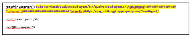 sudo /usr/local/qualys/cloud-agent/bin/qualys-cloud-agent.sh ActivationId=################# CustomerId=########################## ServerUri=https://qagpublic.qg2.apps.qualys.eu/CloudAgent/